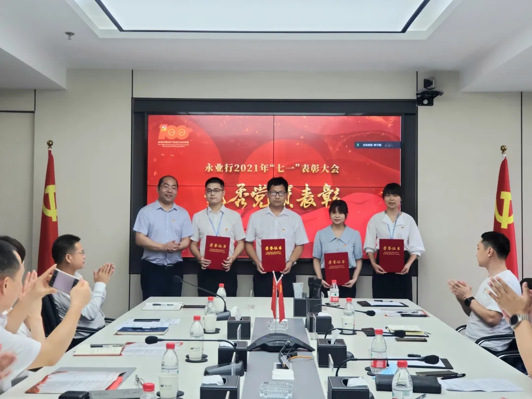 大会在雄壮的国歌声中拉开帷幕。永业行党委委员、副总裁雷小军、文云波分别宣读了《关于表彰2021年先进党支部的决定》《关于表彰2021年优秀党员的决定》,公司党委对自然资源党支部等3个先进党支部、刘亚玲等14名优秀共产党员进行了表彰并颁奖。